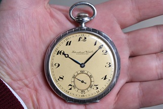 年代:1943年/ 手巻き / 17石 / Cal.67-18'''H5 (IWC) / ケース素材:ニッケル / サイズ:約56.7mm(竜頭含まず) 竜頭:約14.5mm 厚さ:約18mm 価格:990,000円 |
